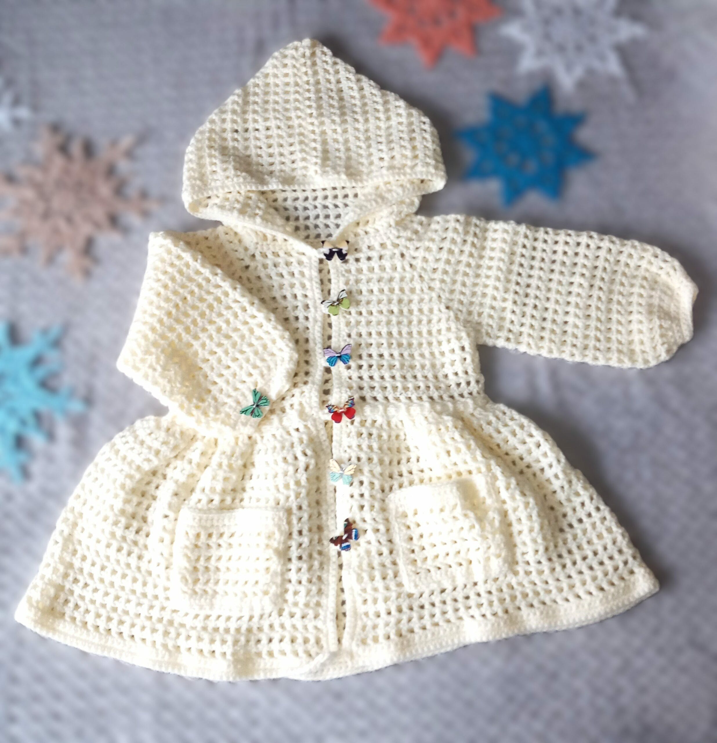 Elegancki płaszczyk wiosenno-jesienny z motylkami i kapturem
