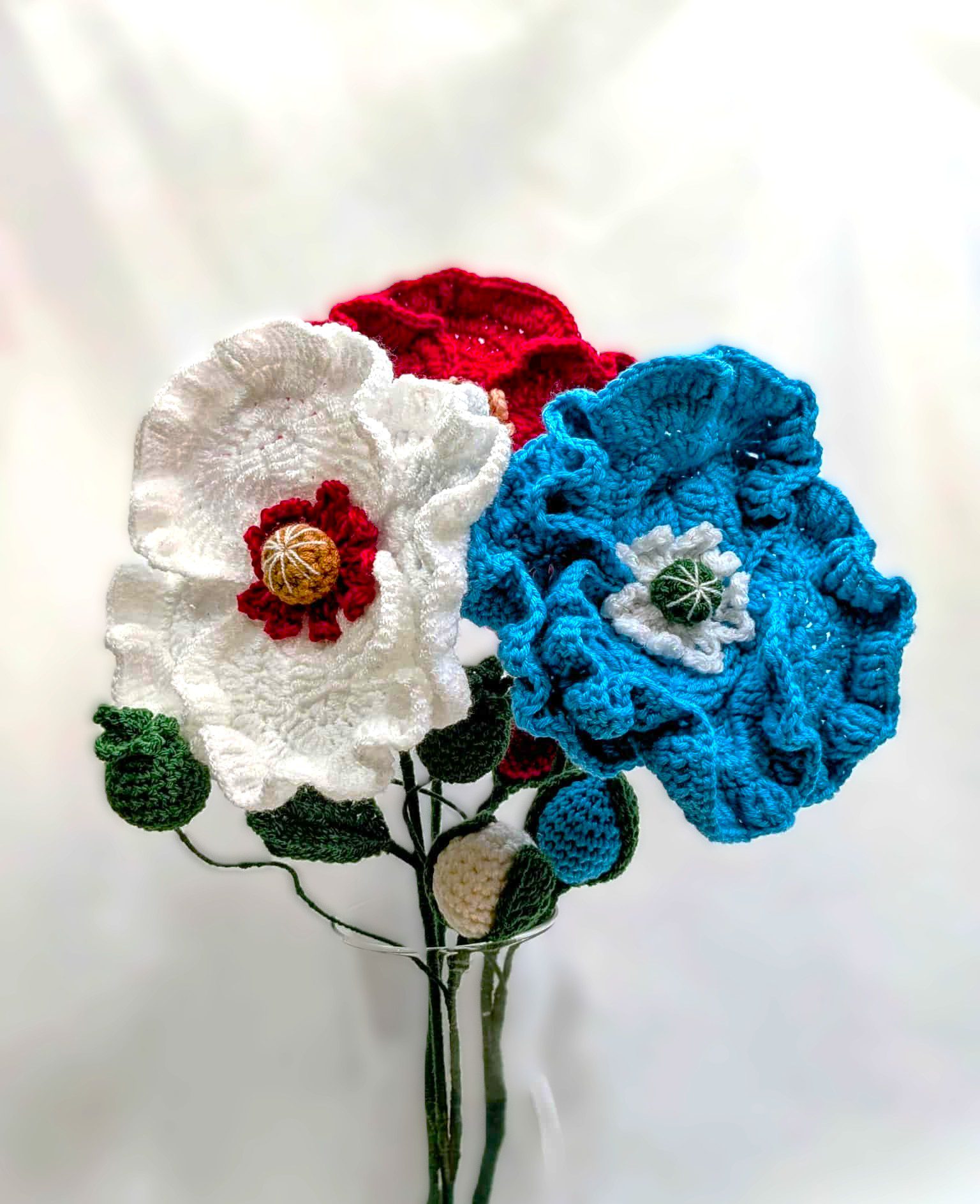 Pojedyncze kwiaty wykonane szydełkiem, gdy chcesz obdarować większą liczbę osób