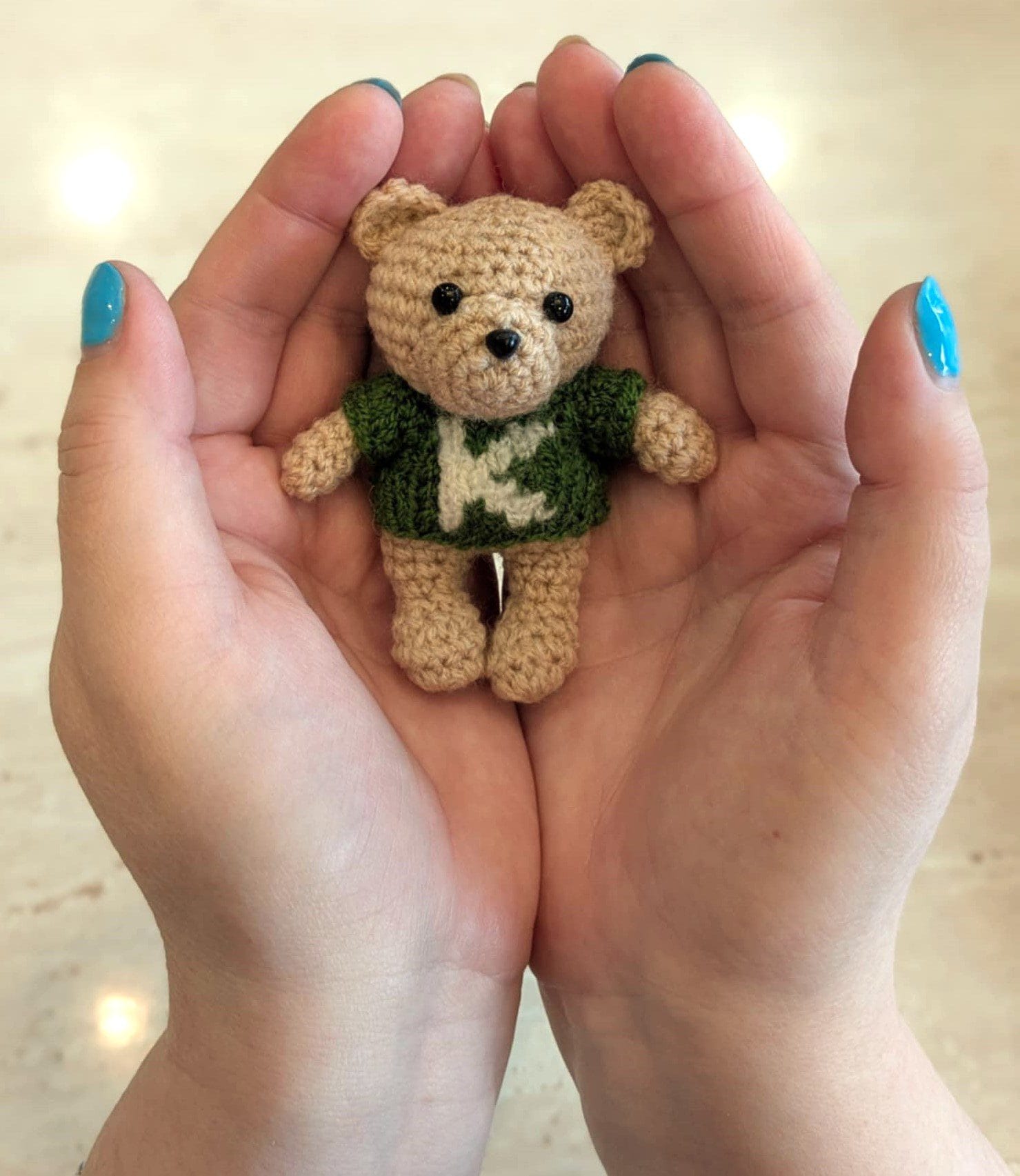 Mały miś wydziergany na wzór dużego misia z dzieciństwa. To jest naprawdę hicior! Jeśli wiesz jaką zabawkę ktoś kochał w dzieciństwie i masz jej zdjęcie, to możesz wprowadzić magię do życia obdarowanej osoby!