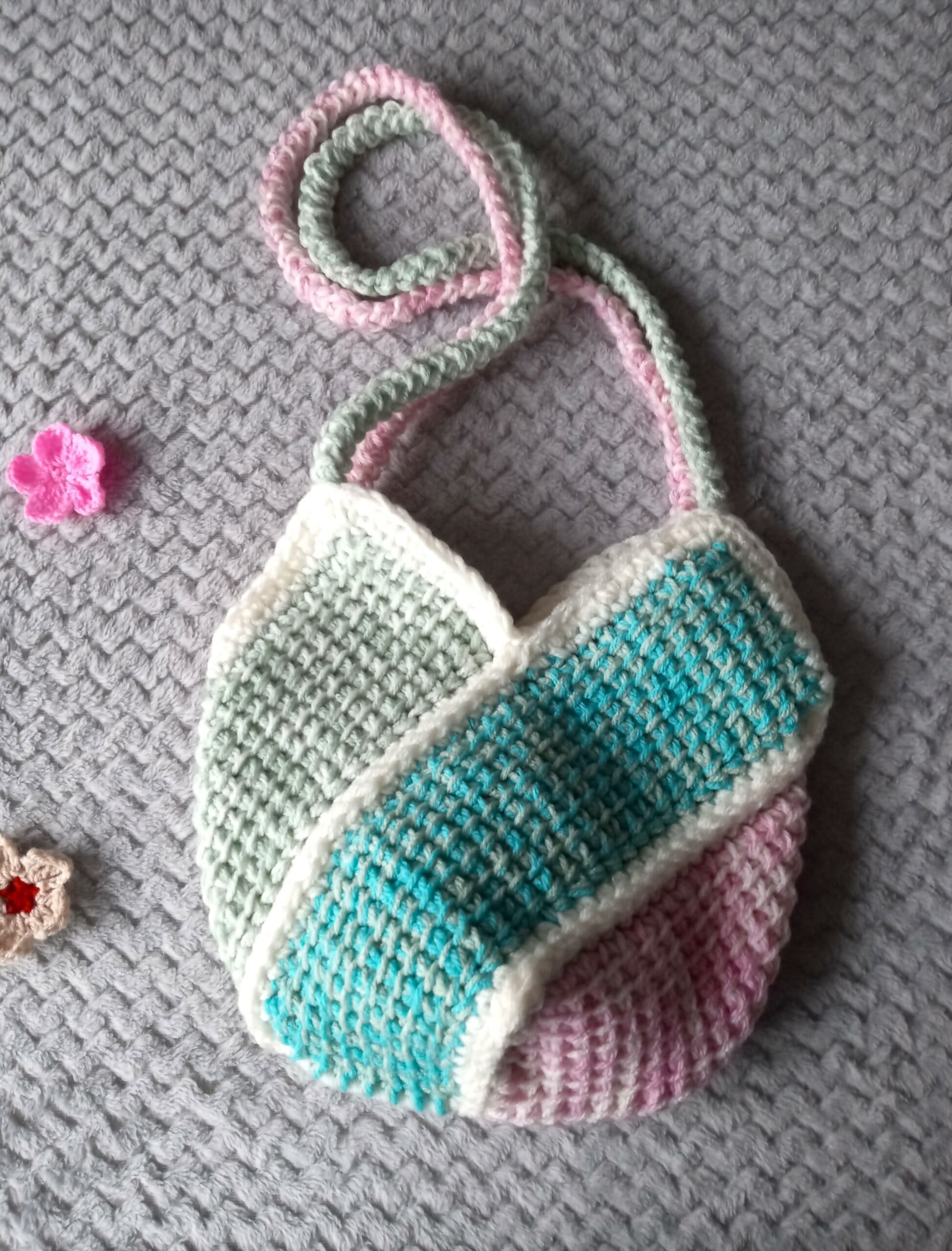 Średniej wielkości torebka, na drobiazgi, wykonana z włóczki, z zapięciem magnetycznym