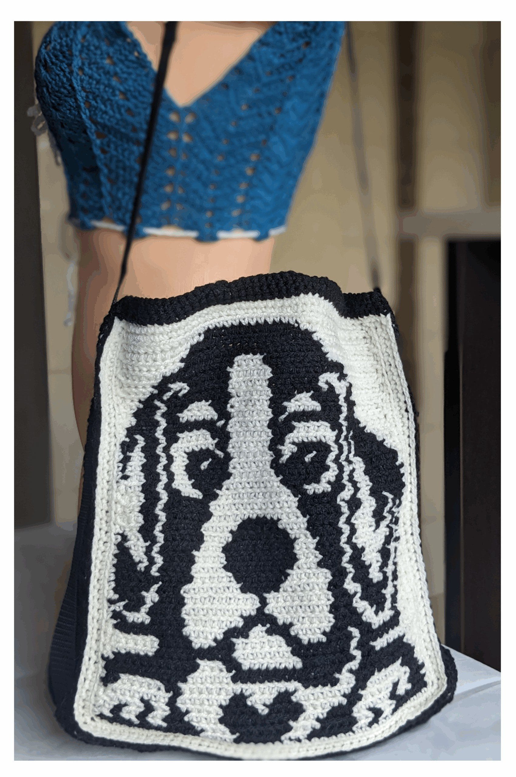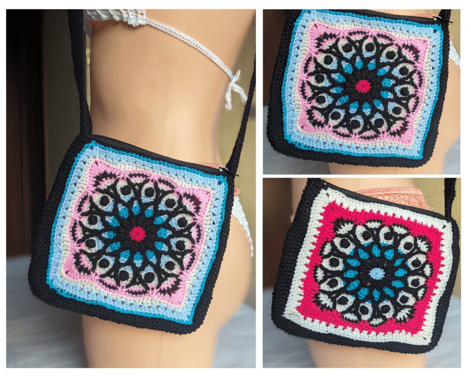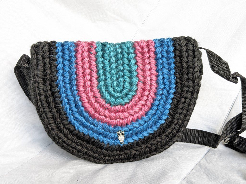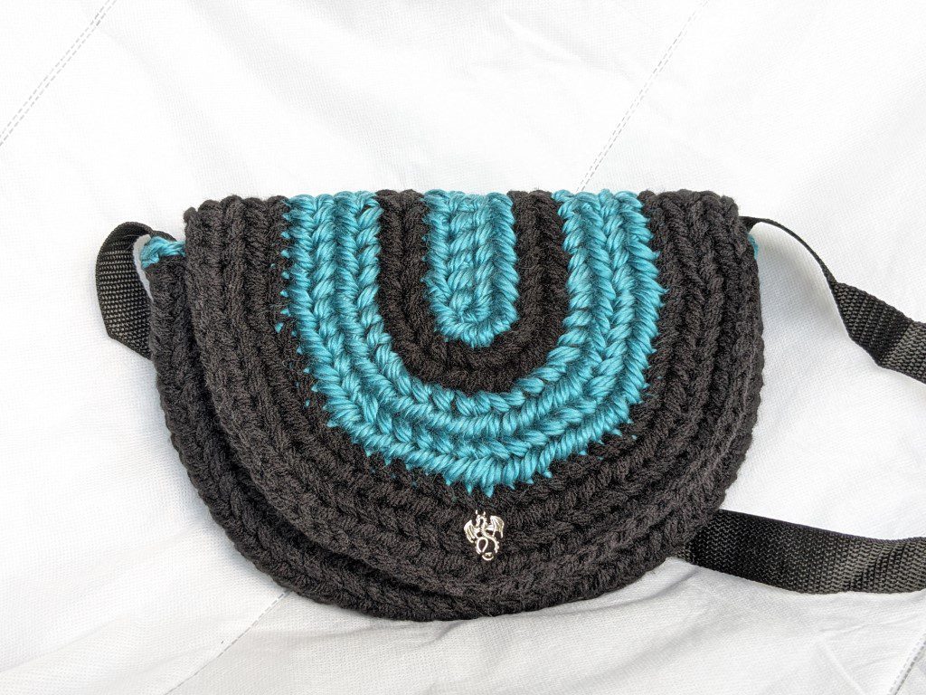 Torebka, wykonana szydełkiem, z zapięciem magnetycznym, regulowanym paskiem i smokiem