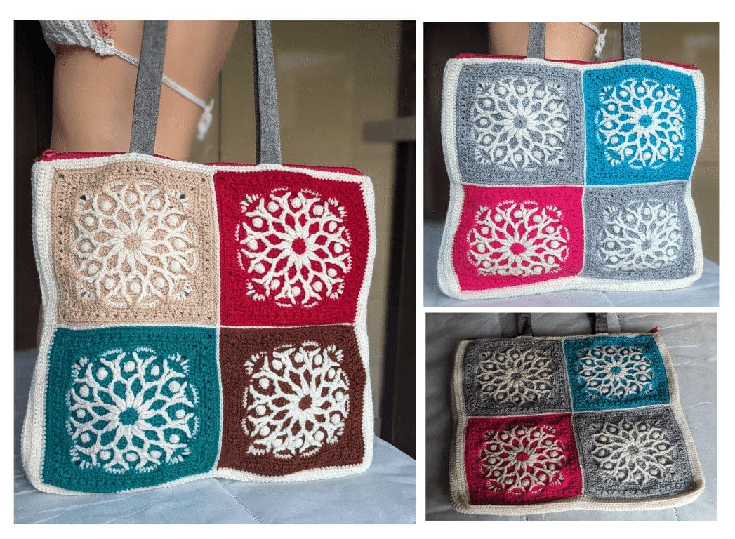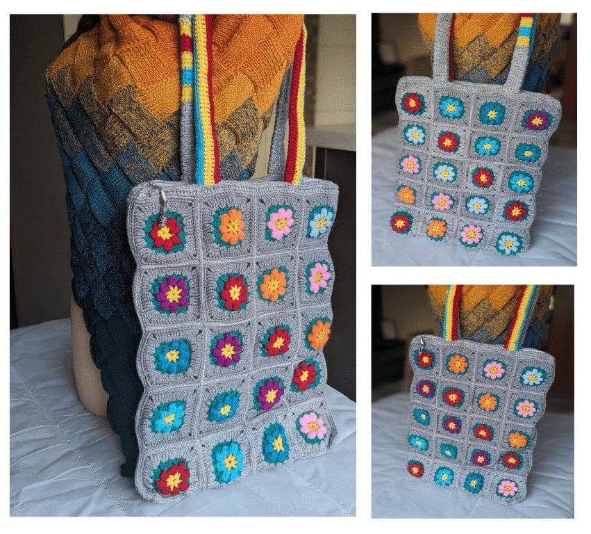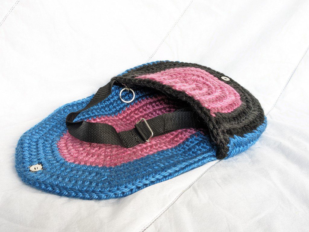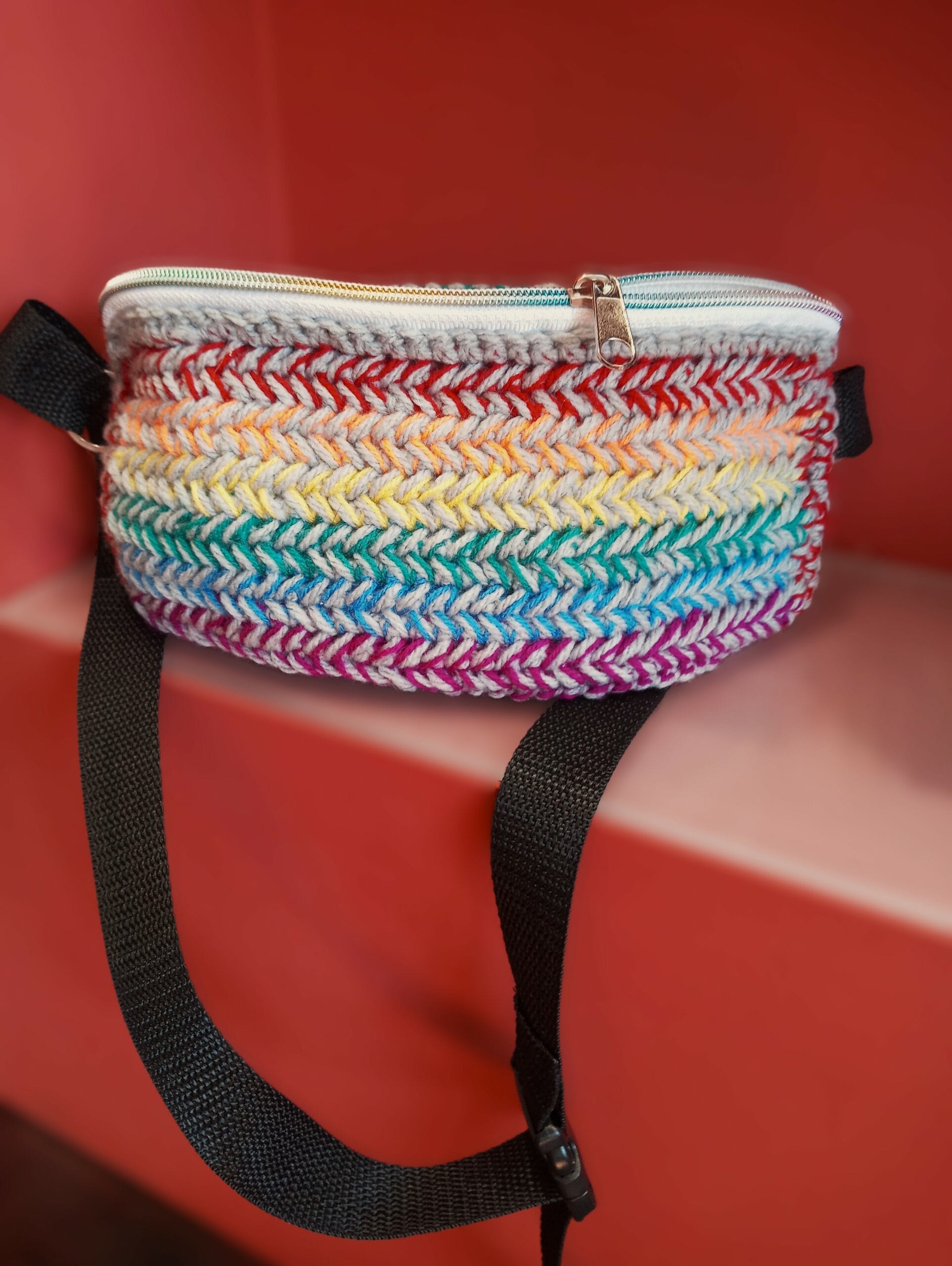 Torebka, wykonana szydełkiem, z zapięciem magnetycznym, regulowanym paskiem i smokiem