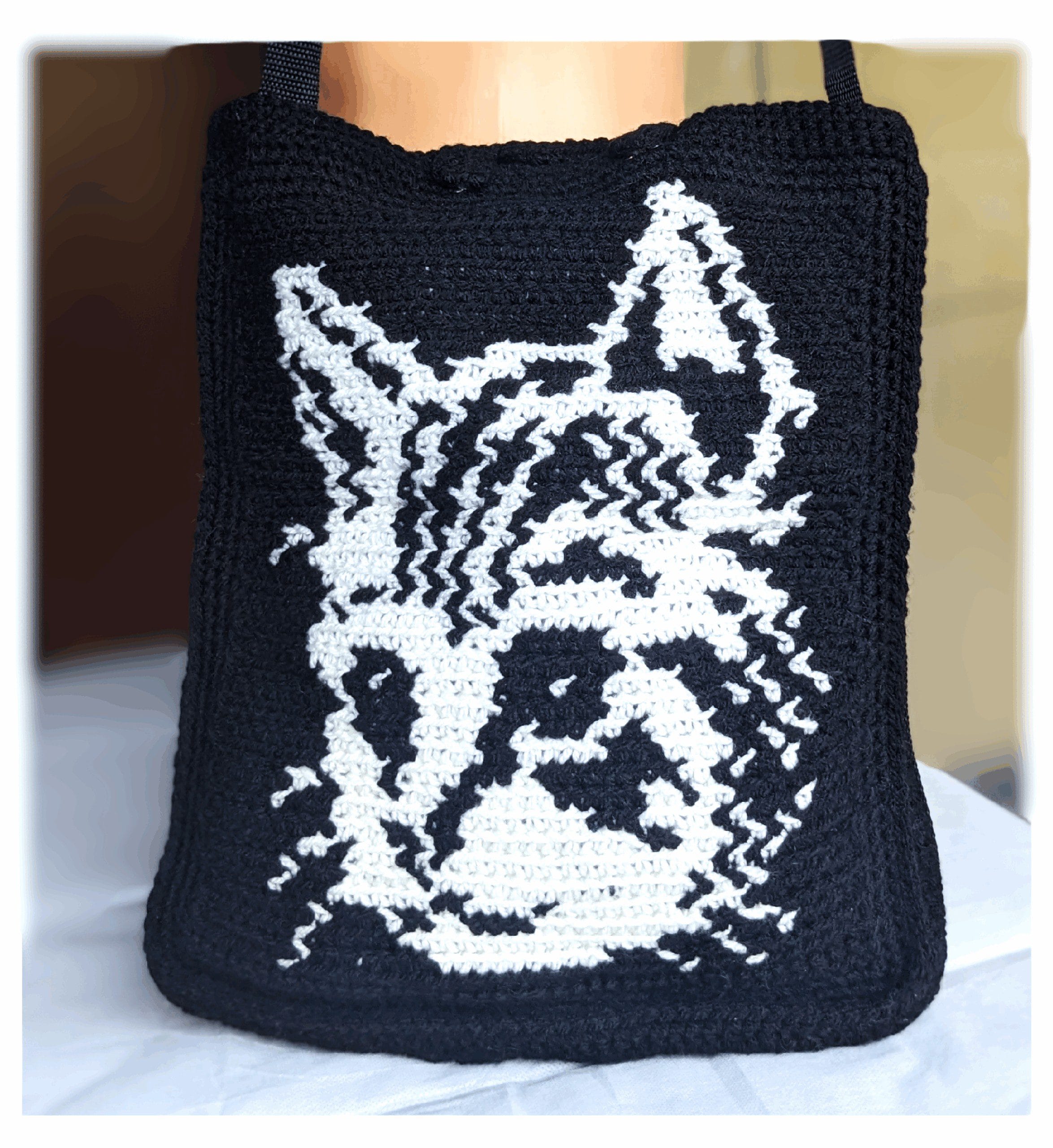 Torebka, wykonana szydełkiem, z zapięciem magnetycznym, regulowanym paskiem i kotkiem