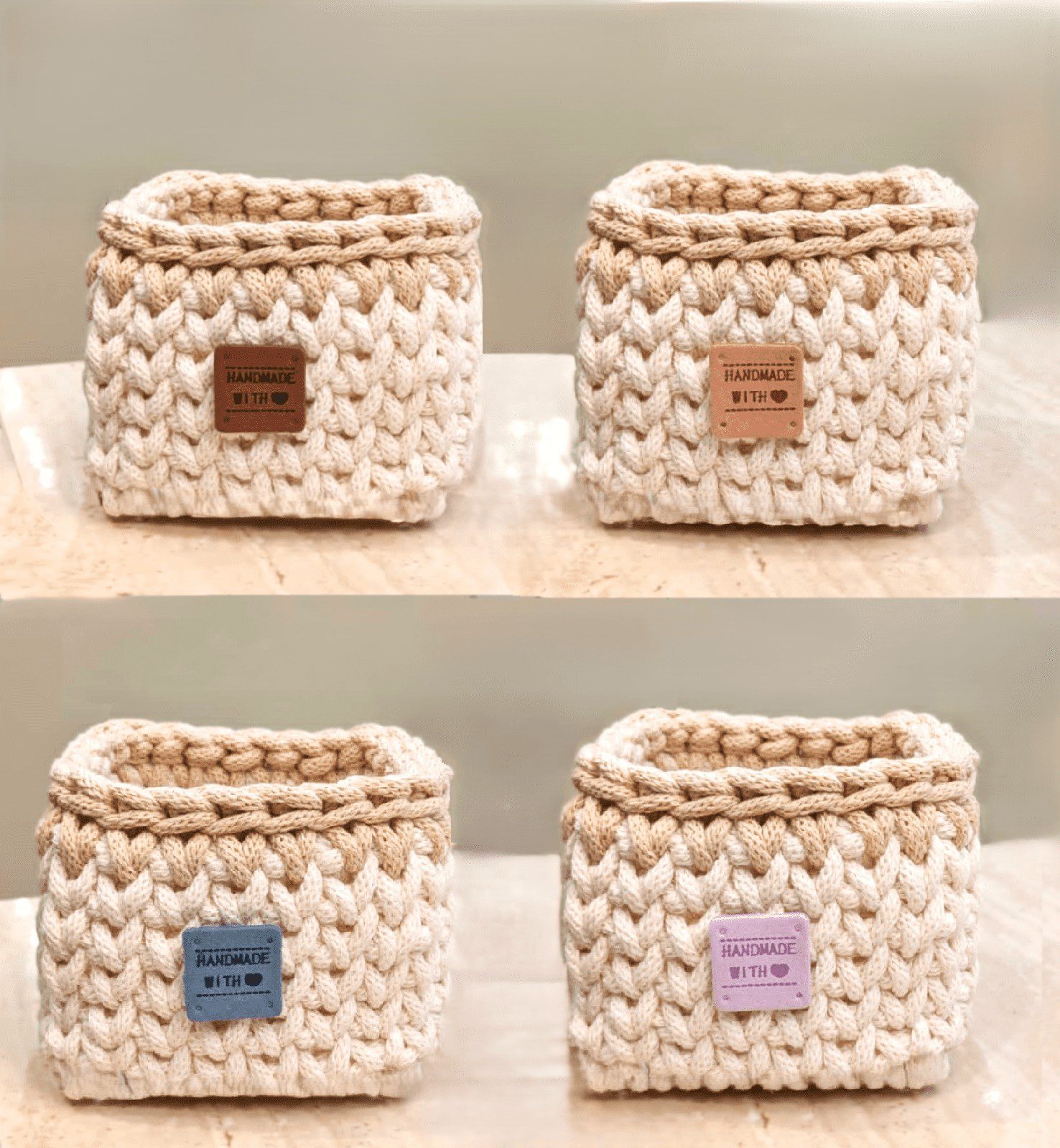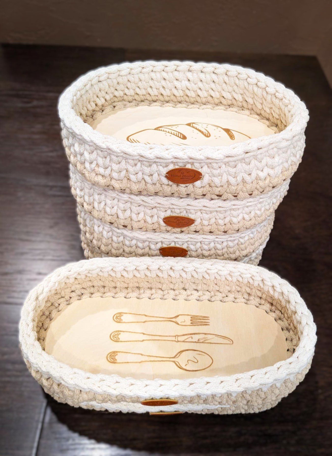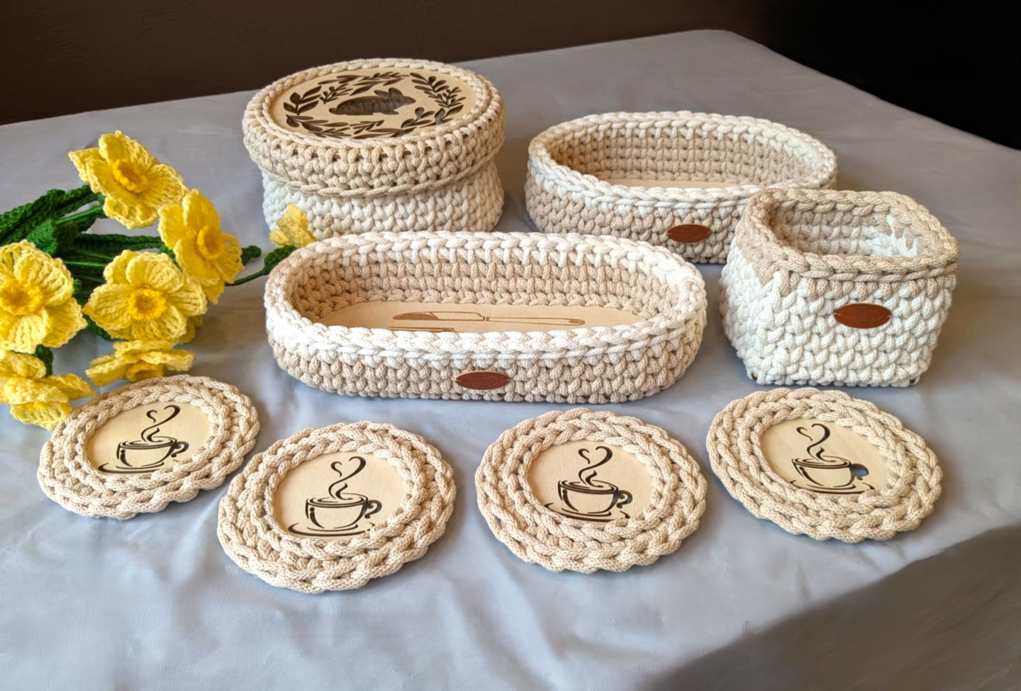 Zestaw wyplatanych ze sznurka koszyczków, z koszyczkiem zamykanym (z zamiennymi pokrywkami na wiele okazji – Wielkanoc, Boże Narodzenie…)