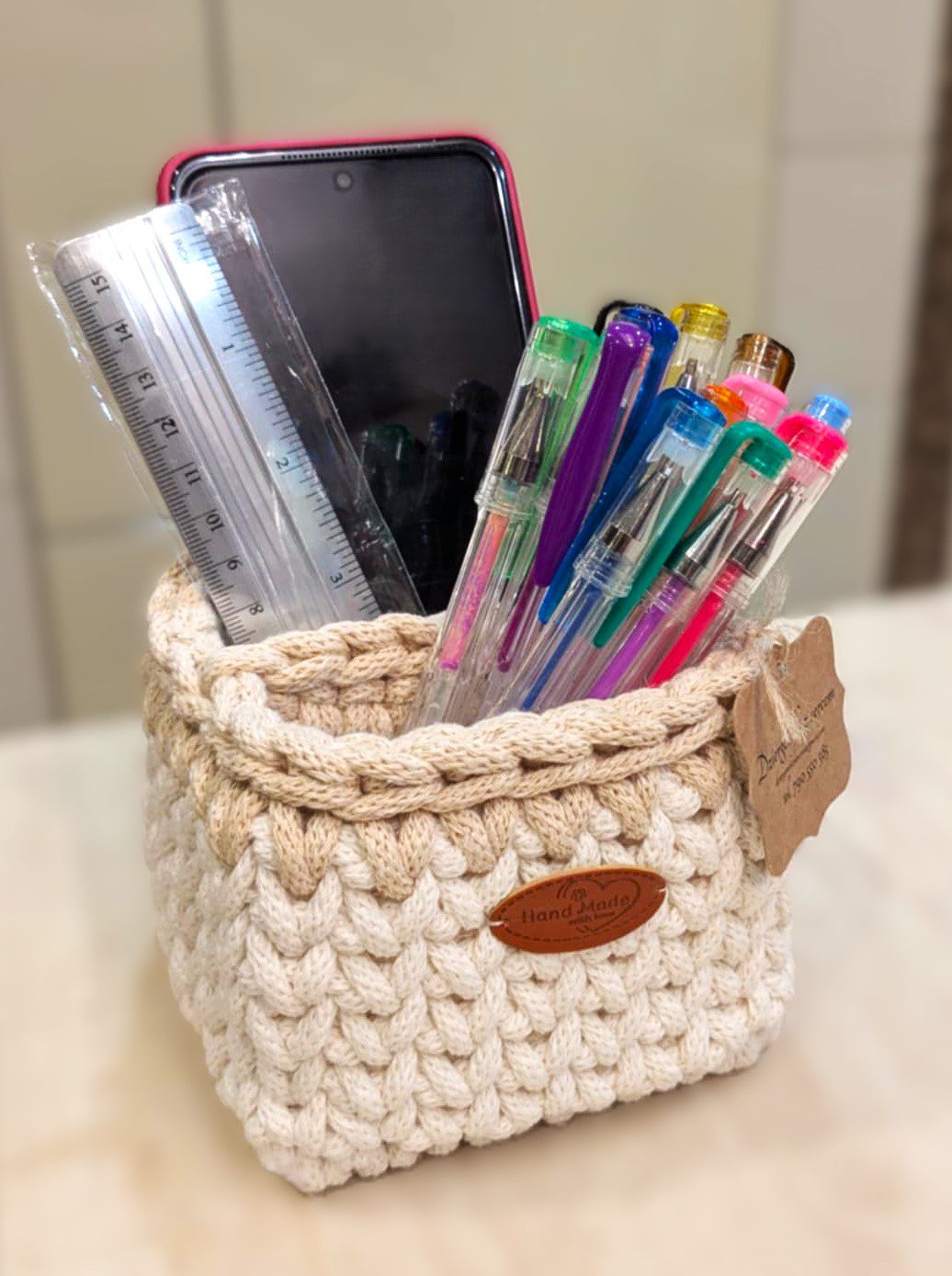 Organizer na biurko, wyplatany ze sznurka, z drewnianym spodem